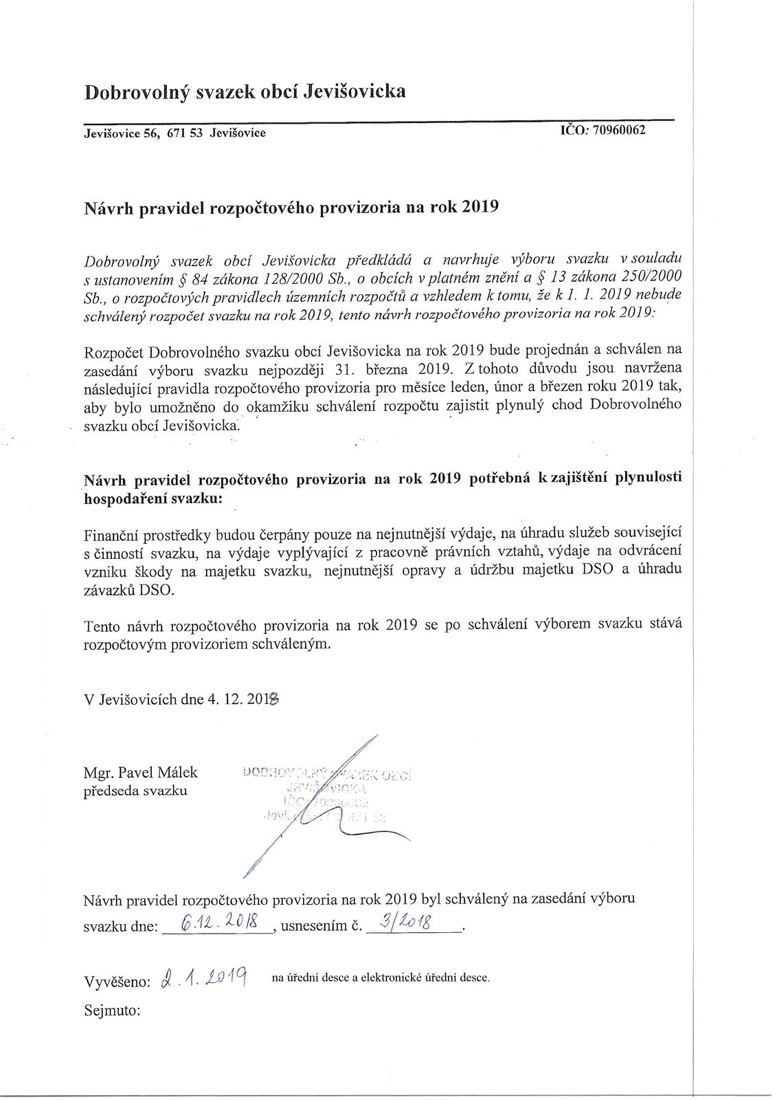 Rozpočtové provizorium rozpočtu na rok 2019, DSO Jevišovicka.jpg